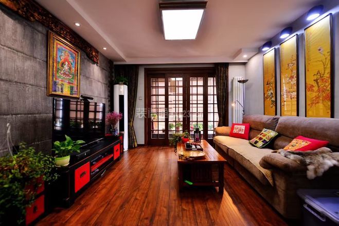 设计理念:玄关用了灰砖装饰,为了寻找纹理自然,更加接近胡同原始风貌的砖,转遍了建材市场最后还是万能的淘宝找到了,但最后也是经过了我们手动的diy特殊处理才出现最后的效果。墙面壁画呢,是客户在法海寺拍的广目天王壁画,顶面是我推荐给客户的一幅坛城做成的壁画。电视背景墙上面的木质雕花,是我们去高碑店古典家具一条街淘来的有些年头的旧物件。客户家里太多全国各地带来的饰品,我们在做设计的时候有很多需要考虑进去。毕竟也是从事艺术工作,客户每天都会有很多新奇特的想法,遇到这样认可自己的客户,整个过程其实还是很享受的。