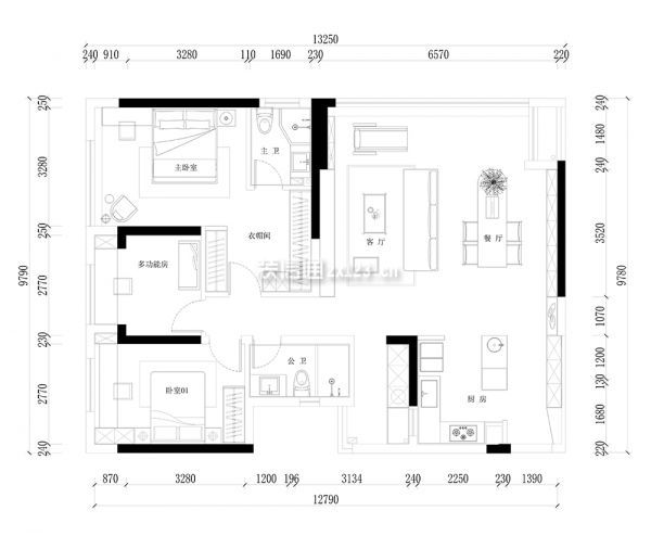 4、卧室、多功能室入口附近墙体多、形成的通道造成空间浪费:拆除多余墙体,改变卧室门方向,减少通道空间;多功能室墙体内推且打半墙,为主卧衣帽间扩宽空间。