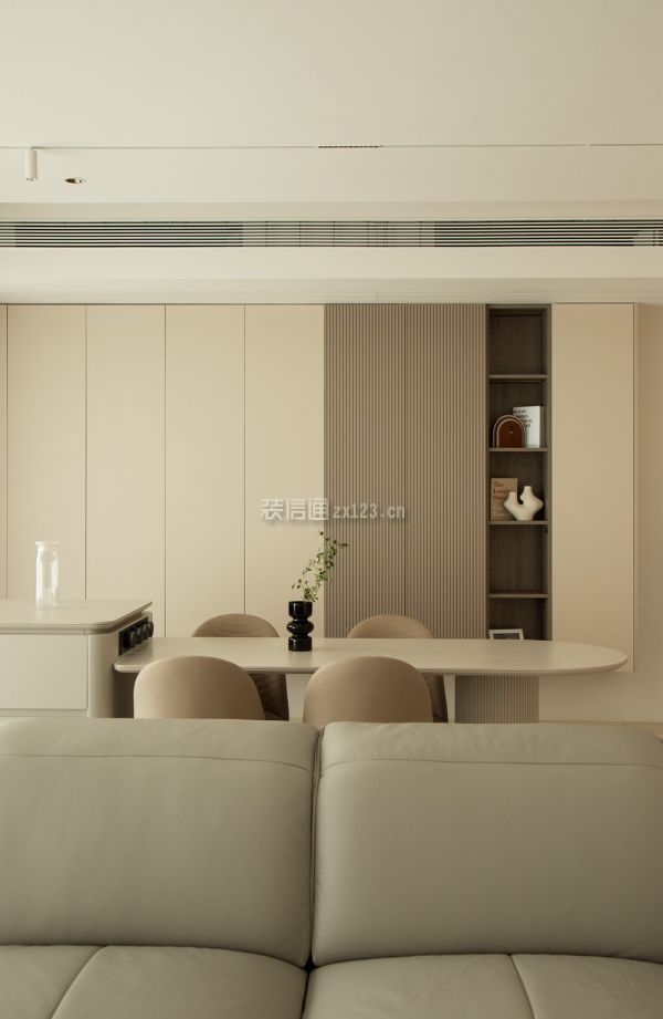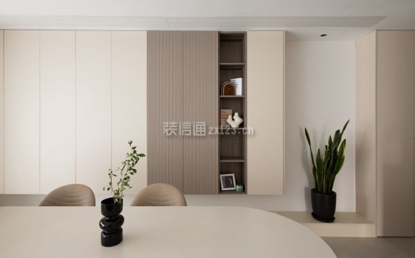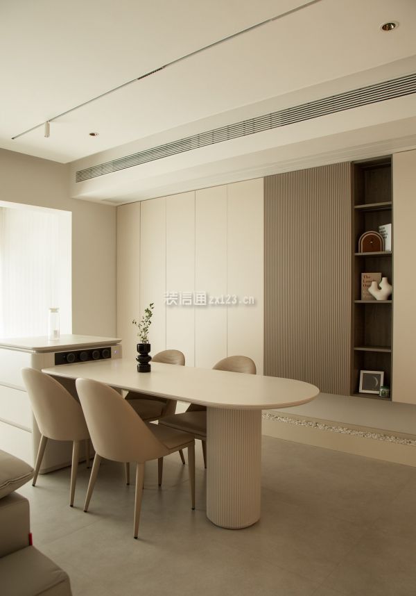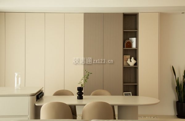 3、餐厅装修:ldk一体化设计打破常规,让客、餐、厨三个空间融为一体,奶白色铺满整个大空间,利落齐平的线条展现规整感的同时形成了过道,区分不同的功能区。从广东定制的餐岛一体式餐桌造型独特,用料讲究。轨道插座增加了生活的便利性,卫生程度也比地插高。圆弧的餐桌边角线条、实木台面的温润质感中和了阳角和储物柜体的凌厉。上方轨道射灯和筒灯作为餐厅的光源,灯光效果可调节,下方鹅卵石点缀在悬空柜体之下,就餐氛围轻松拿捏。
