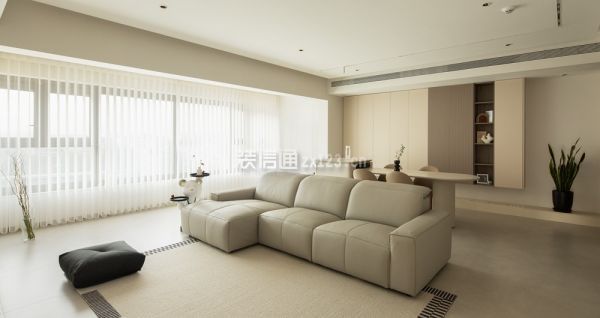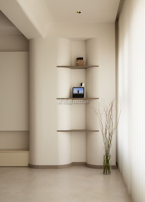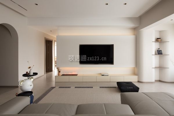 2、客厅装修:干净透彻的颜色,利落舒爽的线条是客厅给人最深刻的印象,素雅白构建了纯洁的基调,少量棕色装饰和黑色线条点缀其中,增添活跃之感。无主灯设计为顶部空间减少赘饰,悬浮吊顶增加纵向延伸感。从进门到阳台,6.5m长的距离几乎全做了储物柜设计,仅在中间部分打造了一个展示格,用绿植打造出中线端景。“l”型镂空让靠近阳台一侧的柜体悬空,部分木格栅造型柜门、开放式展示柜穿插其中,避免了全是柜门带来的沉闷。5.3m长的景观阳台尽数纳入客厅,为了让更多自然光进入家居空间,客厅的窗帘选用了轻薄的白纱梦幻帘,光倾洒入客厅,没有墙体的阻碍,随着空间的延展在家中蔓延。翻一本好书,看一场电影,与家人靠在软牛皮沙发上,或是就着柔软的地毯席地而坐,享受温柔平静的亲子时光。悬浮电视背景墙将电视完美内嵌,插座、网络接入口、机顶盒等物件巧妙纳入下方的地台柜中。从侧面看无凸出部分,没有杂乱的电线露出,高级感满满。乳白色定制地台柜代替了传统的电视柜,加装的雾化壁炉可以在冬日里为这个清冷的空间增添一丝暖意,橘红色的壁炉灯光与嵌在电视背景墙边缘的暖色灯带交织成落日余晖的画卷。既是为了包裹阳台落水管,也是为了弱化上方梁的存在感、增添柔和之意,阳台的展示柜的圆弧造型延伸至梁的位置,吊顶也采用了立面弧形吊顶。木作弧形造型预留凹槽,形成独特的内龛造型展示柜,三层褐色的隔板可以放些精致摆件,也与进门整墙储物柜开放格的隔板材质一样,点对点的呼应让整体氛围更为和谐。家政间仅做了拱形门洞,开放式的格局增添过道的通透感,这种自由的呼吸感自客厅发散到其他几个空间。一侧墙面用倒立拱形的棕色壁画打破大白墙的沉寂,在造型上和门洞相呼应,趣味十足。