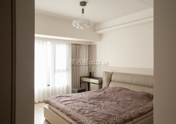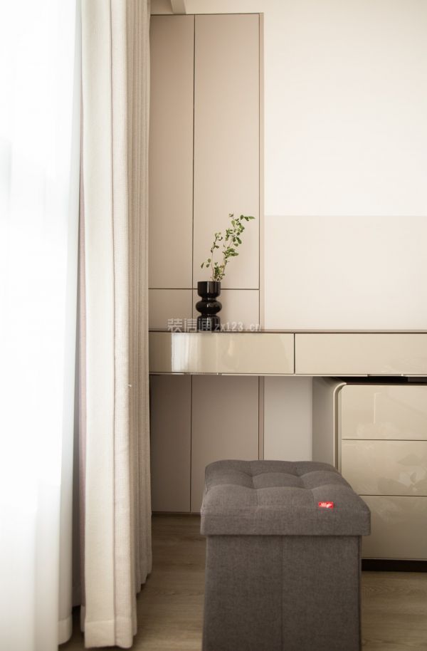 5、主卧装修:主卧的延续简洁大方的设计思路,布局方正,色系使用与公区一致,但增添了更多粉调颜色的使用,营造出静谧安宁之感。卧室的地面均用强化木地板代替了瓷砖,木元素的搭配碰撞出家的温暖,温度就在脚下。进入休息区域的两侧墙体均做了定制柜体,打造出步入式衣帽间,超大储物空间让夫妇二人均有属于自己的衣柜,同时也是进入更私密区域的一个缓冲地带。靠窗一侧的床头柜用梳妆台代替,金属的表面材质增添时髦气息,拆掉飘窗之后的空缺用内嵌储物柜填满,台面放不下的东西便可以存在其中。