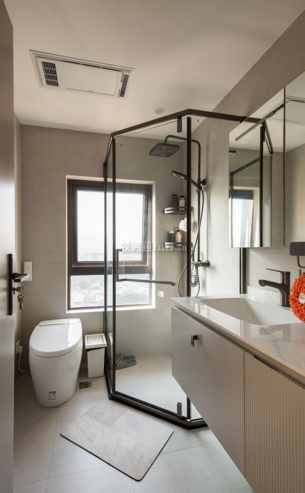 7、卫生间装修:卫生间主打简单设计,方便清洁。黑色窄边框钢玻对淋浴区做了包围,很大程度上防止了水花溅到马桶和洗手柜上。卫生间悬浮洗手台和台下盆设计不留卫生死角,视觉上也更加通透。