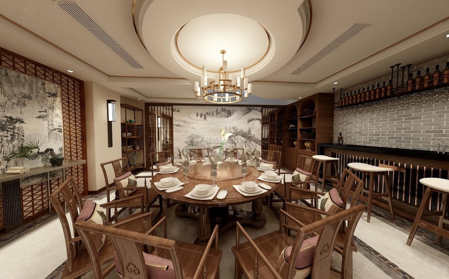 案例名称:融创唐顿庄园428平米中式风格别墅装修设计效果图