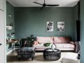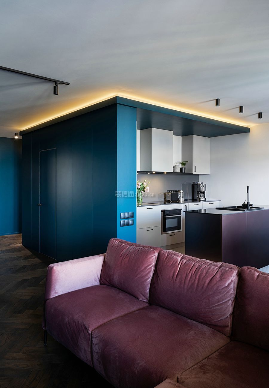 设计理念:整个室内以现代风格为主,运用了大量浓重的色彩。 起居室同样以深色调为主,蓝色的墙面白色的天花板,加深了空间纵深又增加了层高。客厅选用粉色的沙发带来了一丝活泼感也增添了浪漫氛围,同时也作为隔断使用。