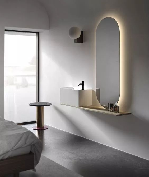 台盆也可以融合到其他空间,发挥功能性,但会涉及各种开墙凿孔,而且建好后没法再移动,所以装修之前要仔细考虑哦。