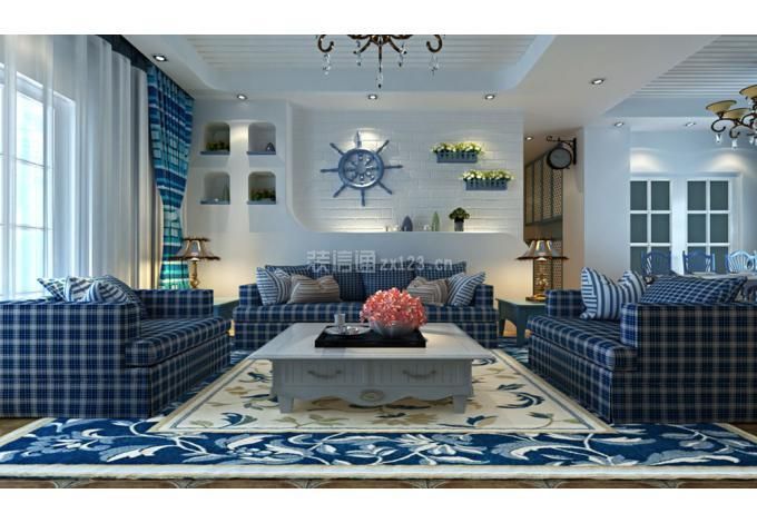 设计理念:设计亮点:蓝色与白色的和理结合象征着美丽的大海与白色的细沙,显示出神圣与纯洁。俏皮的曲线条造型,仿古的地面选材与格子布艺的结合配合的非常和谐。 色彩搭配:整体空间色彩以蓝色为主。