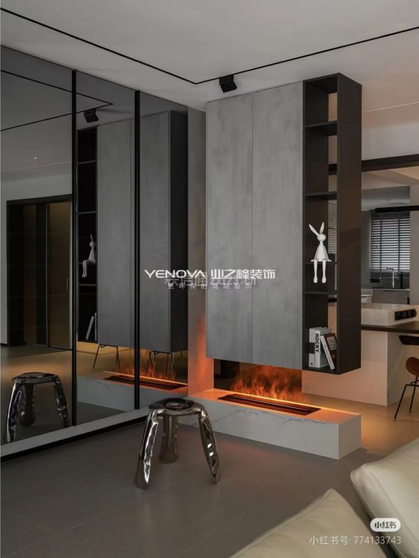 *进门位置做了一排深色镜面鞋柜,一门到顶的设计,镂空了底部,方便出入换鞋和放扫地机器人正对面做悬空柜体,局部隔断厨房,做透景设计处理,底部加上现代壁炉形式设计,质感满满