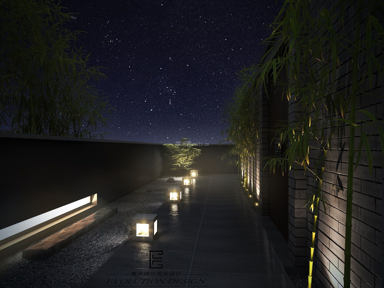 设计理念:庭院运用中国四君子之一的“竹”,作为主要的装饰材料。星光从顶上的竹间倾落,点点斑驳的光点,听风声习习、晚风凉凉,煮一盏清茶,别有一番风味。沿途暖暖的路灯,在晚间指引方向,为心间增加更多的暖意。竹影倒印在墙面,为庭院更添热闹的氛围。