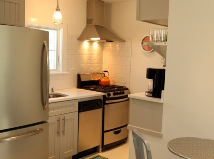 厨房灯光要分成两个层次:一个是对整个厨房的照明,一个是对洗涤、备餐、操作的照明。照出来的灯光必须是白色,否则影响颜色判断。同时要避免灯光阴影,不适宜使用射灯。